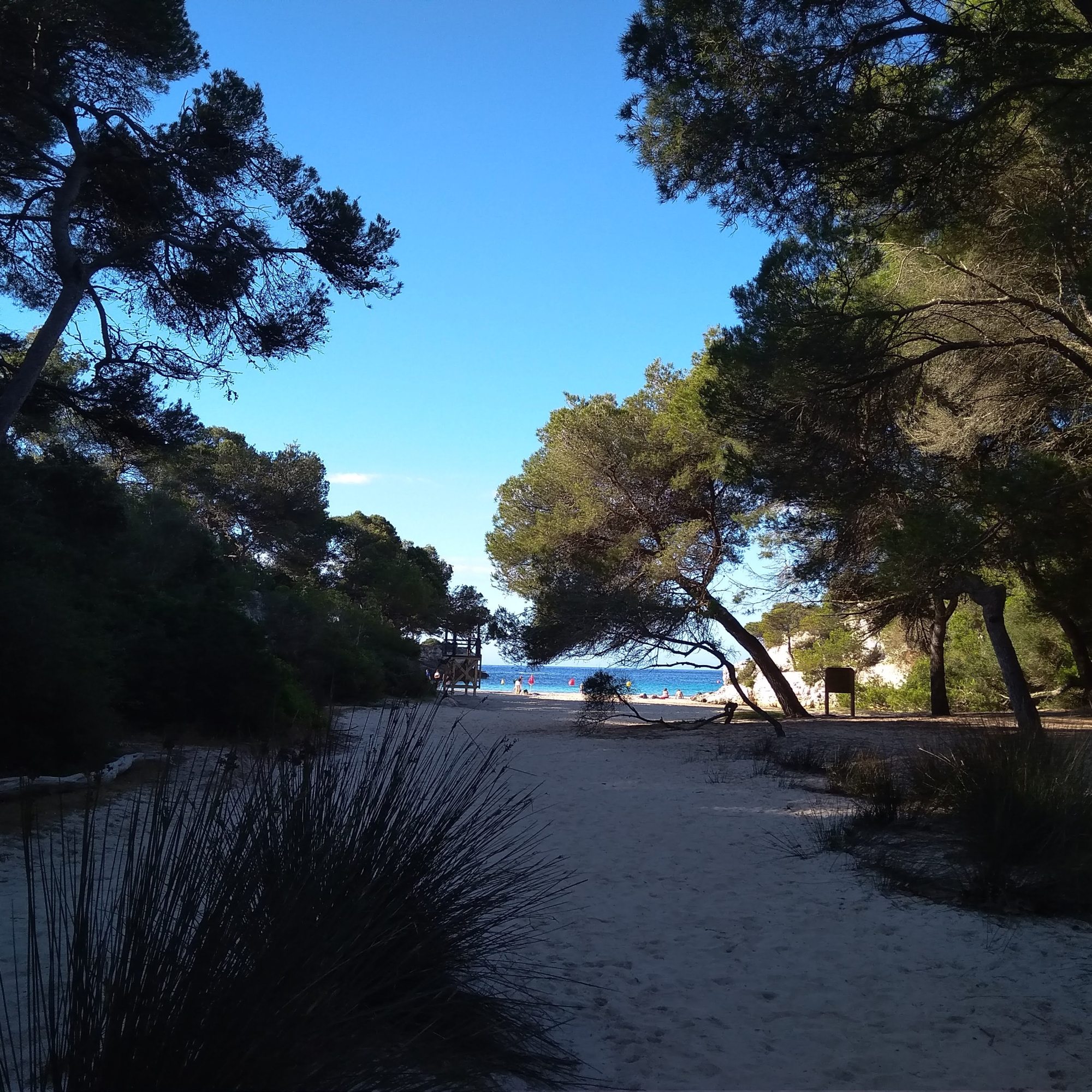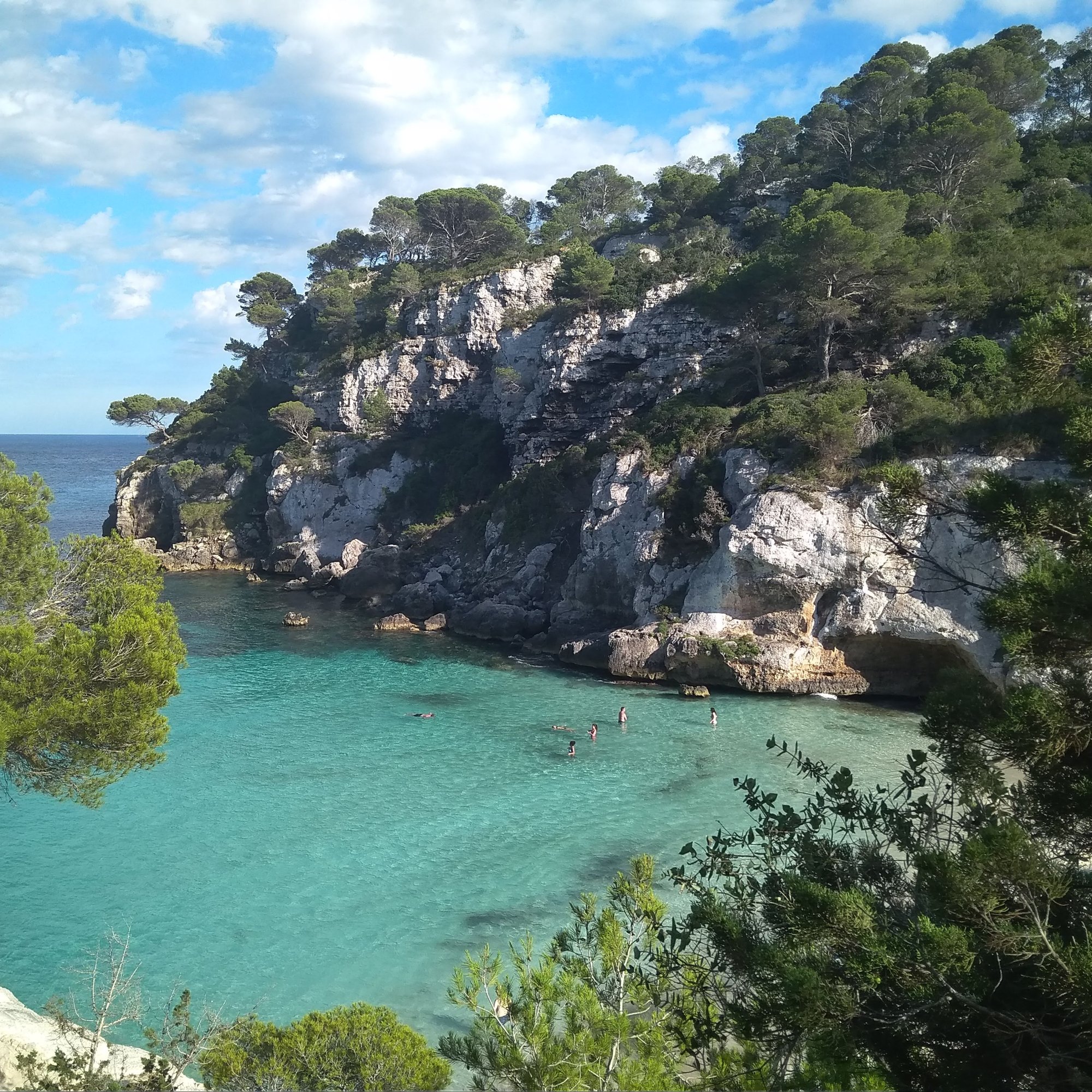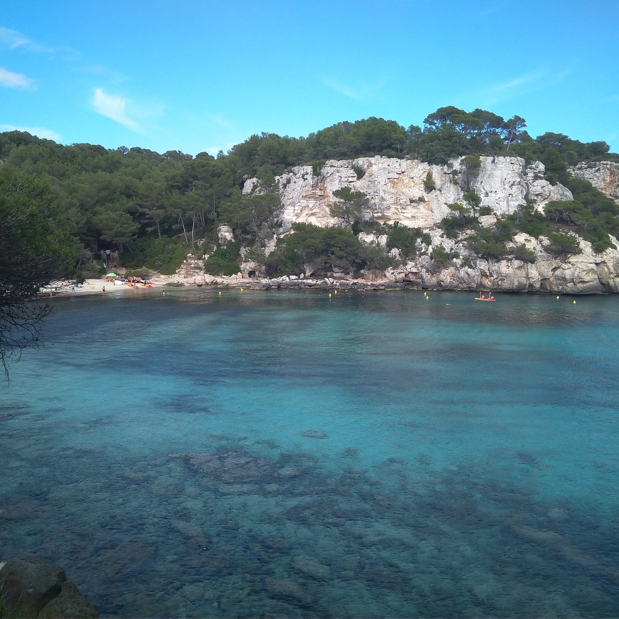 - Cala Macarella: El acceso es andando (paseo largo) o en bus (o en barco). Tuvimos la mala suerte de que el día que la visitamos estaba el mar muy revuelto y había muchas algas, además de mucho aire, con lo que no la disfrutamos. Pero sé de gente que ha estado y dice que es de las mejores y que llegaron a ver una manta-raya.