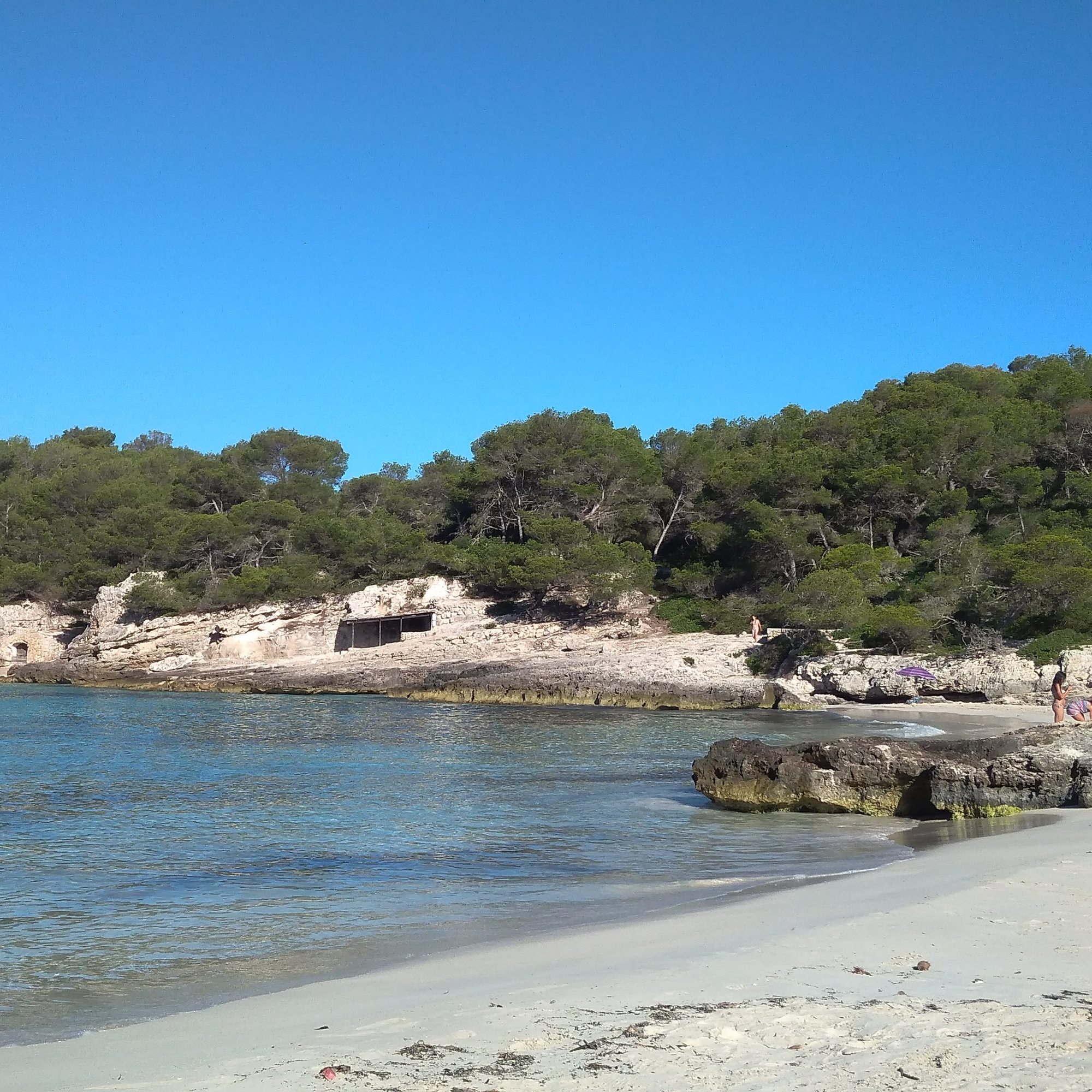 - Cala Mitjana: En esta playa la arena es blanca y fina y el agua es muy clarita. Para llegar hay que dar un paseo fácil como de quince minutos. Toda la zona de detrás está llena de pinos, y hay mucha gente. Pasan de vez en cuando con fruta que te preparan allí mismo (mola un montón cómo abren el coco o parten la sandía) y bebida. Por cierto tiene merenderos por si quieres llevarte la comida